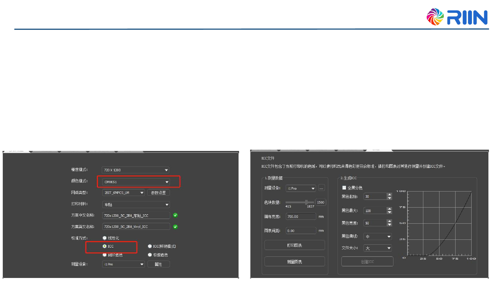 ①自研ICC与四色自研ICC一致,创建曲线时选择ICC,目前多专色色块可以自行选择,设置画布,间距