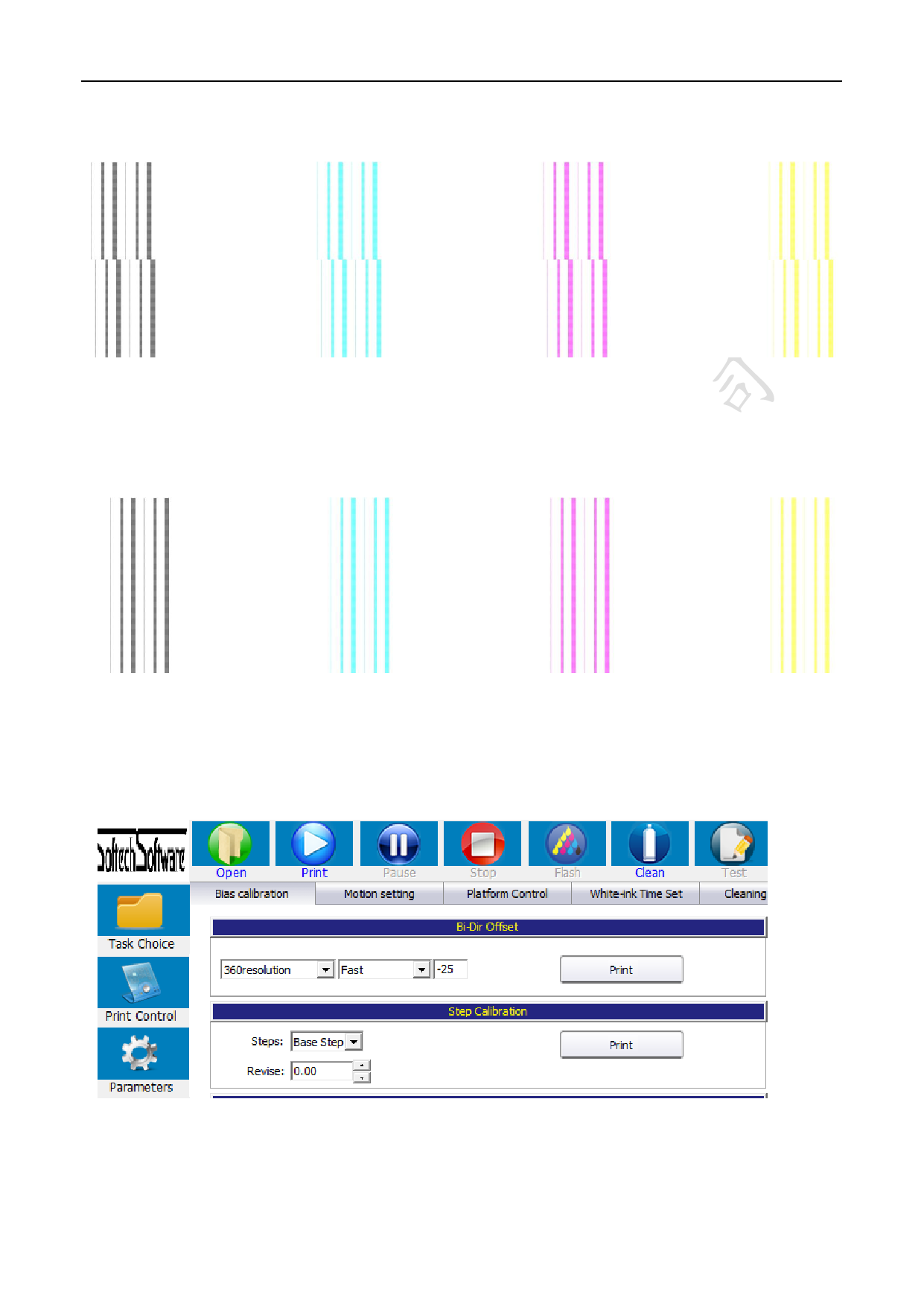 Click the Maintenance,select Bias calibration, Step calibration,lastly click Print, as shown in the