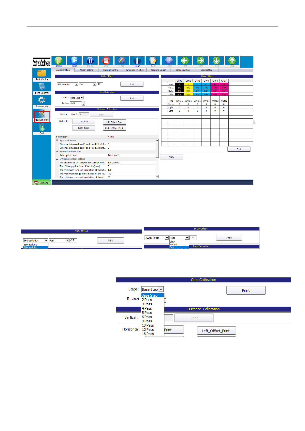 Bi-Dir Offset: Before printing, 180resolution, 360resolution, slow, normal and fast speed