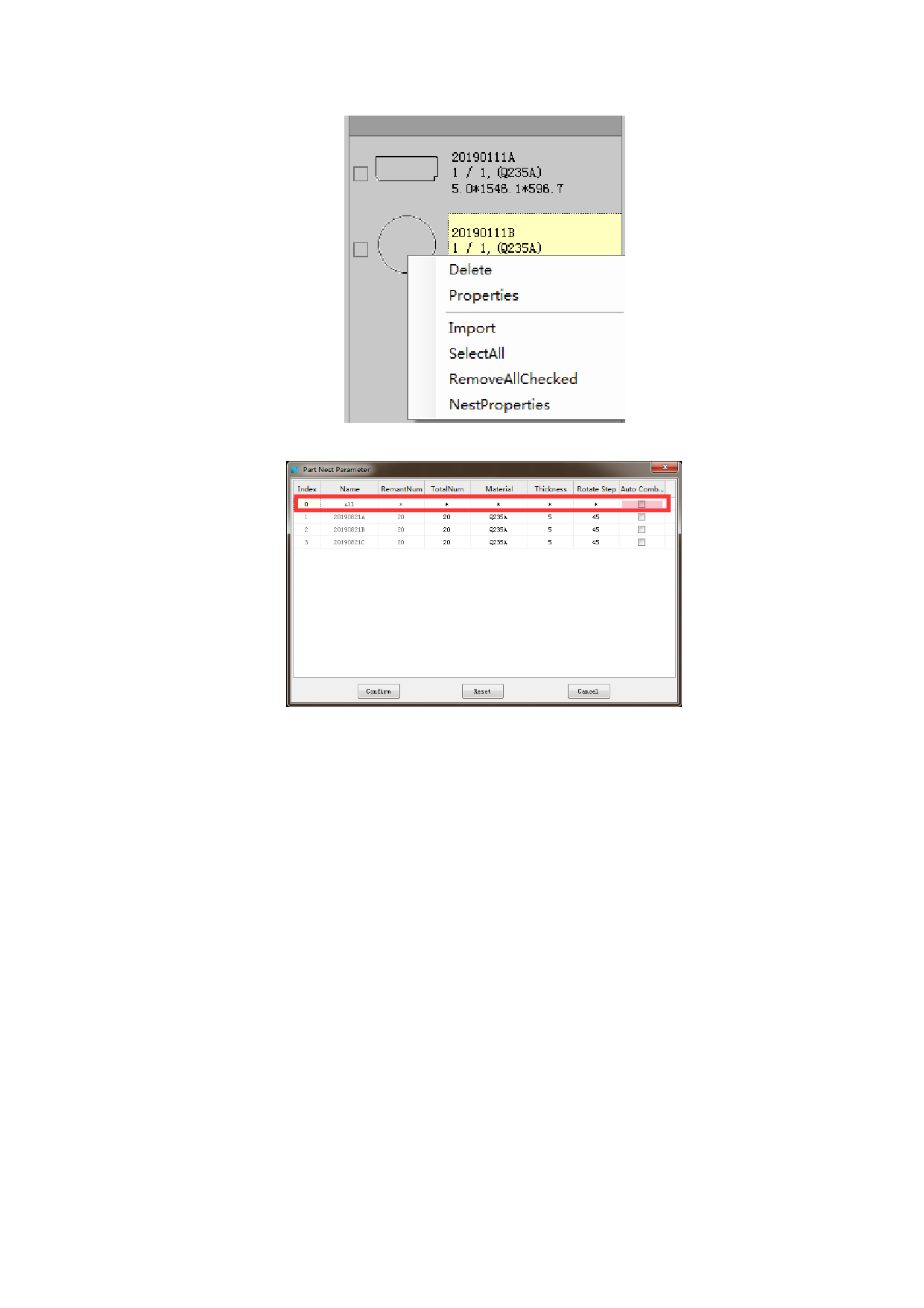 The parameter of rectangular plate can be set in the auto nesting. As shown