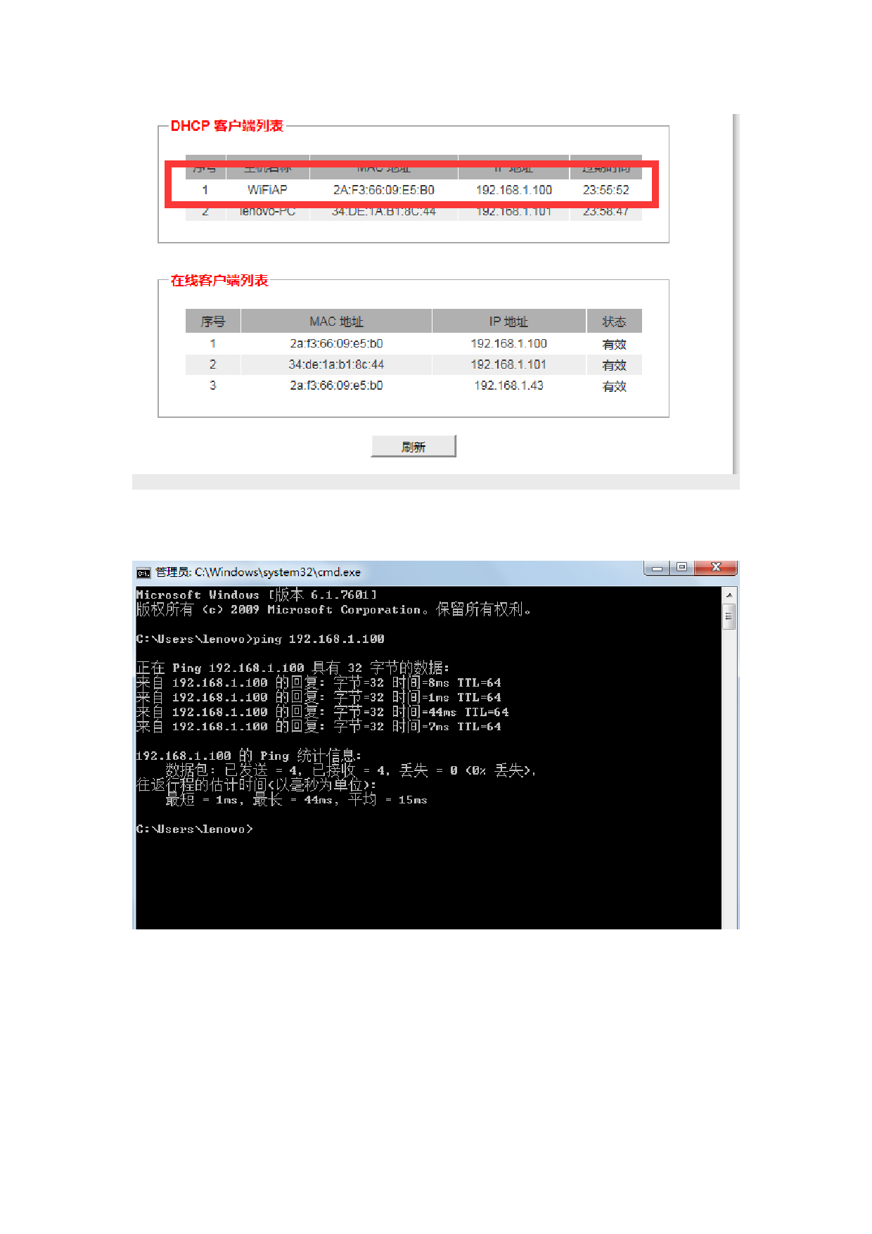 在 cmd 窗口,输入 ping 192.168.1.100