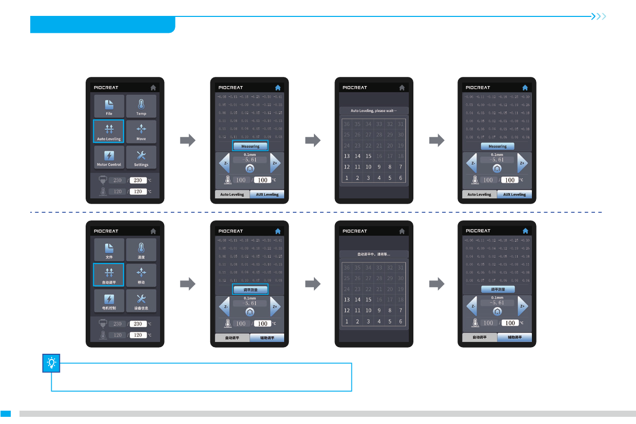 1 Select “Level”to automatically level. 选择首页 调平,即可自动调平;