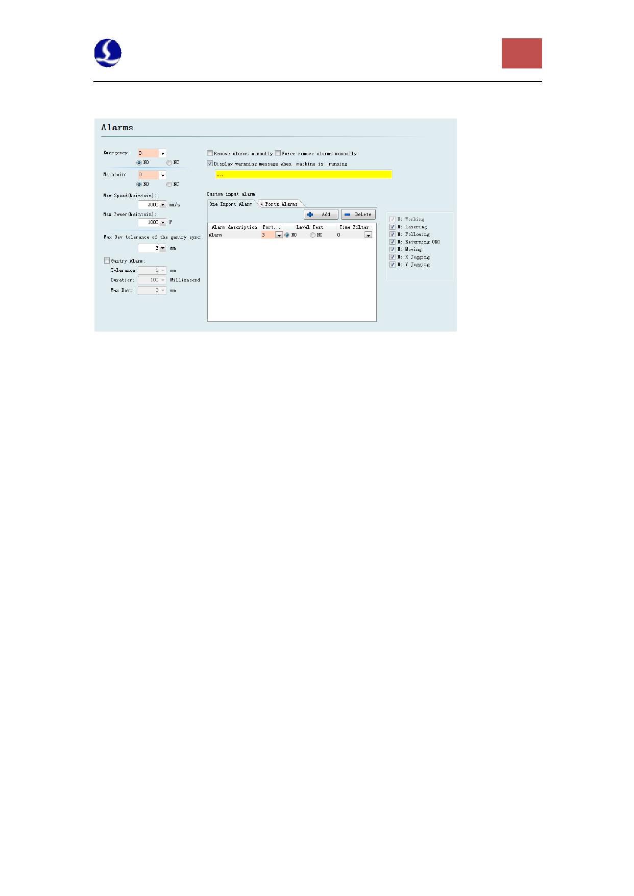 temperature alarm, laser head collision alarm, etc.