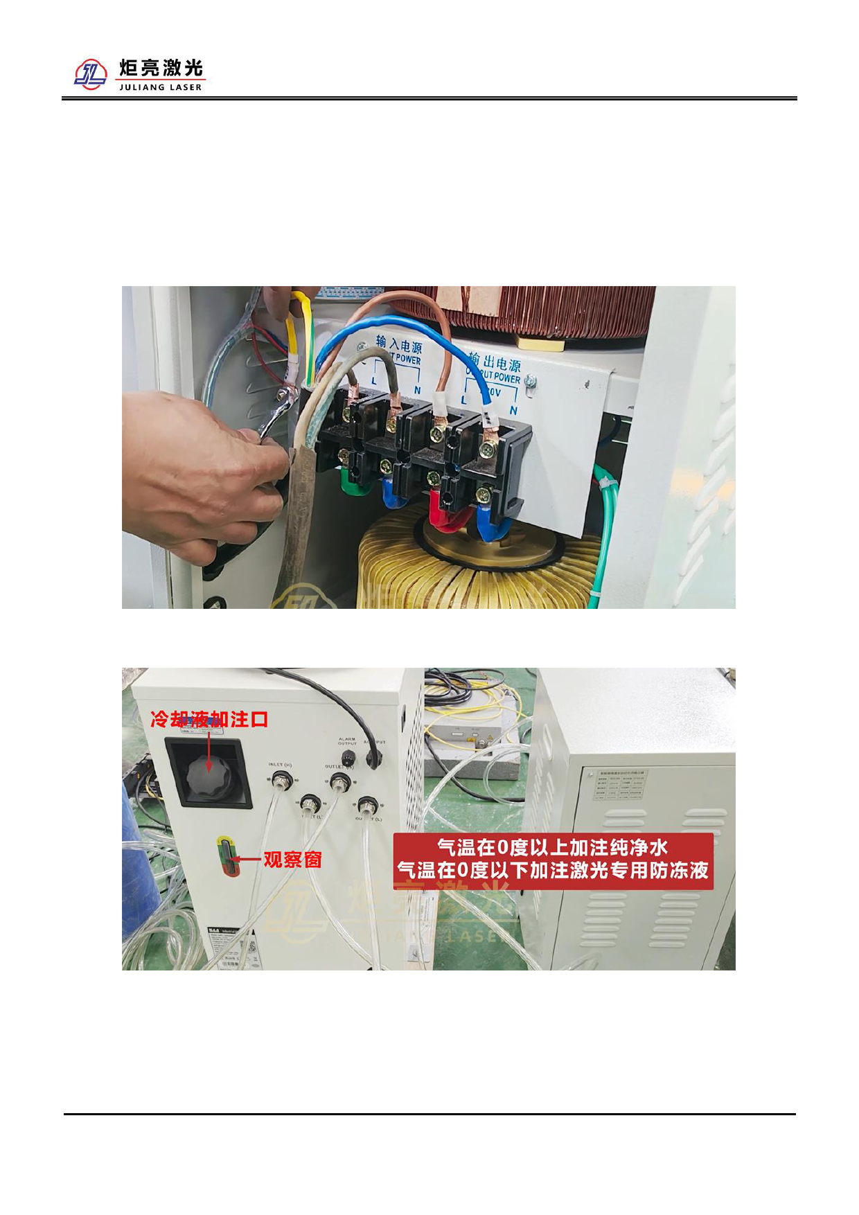 拧开冷水机加注口的盖子,气温在 0 度以上加注纯净水,气温在 0 度以下加注激光专用防冻