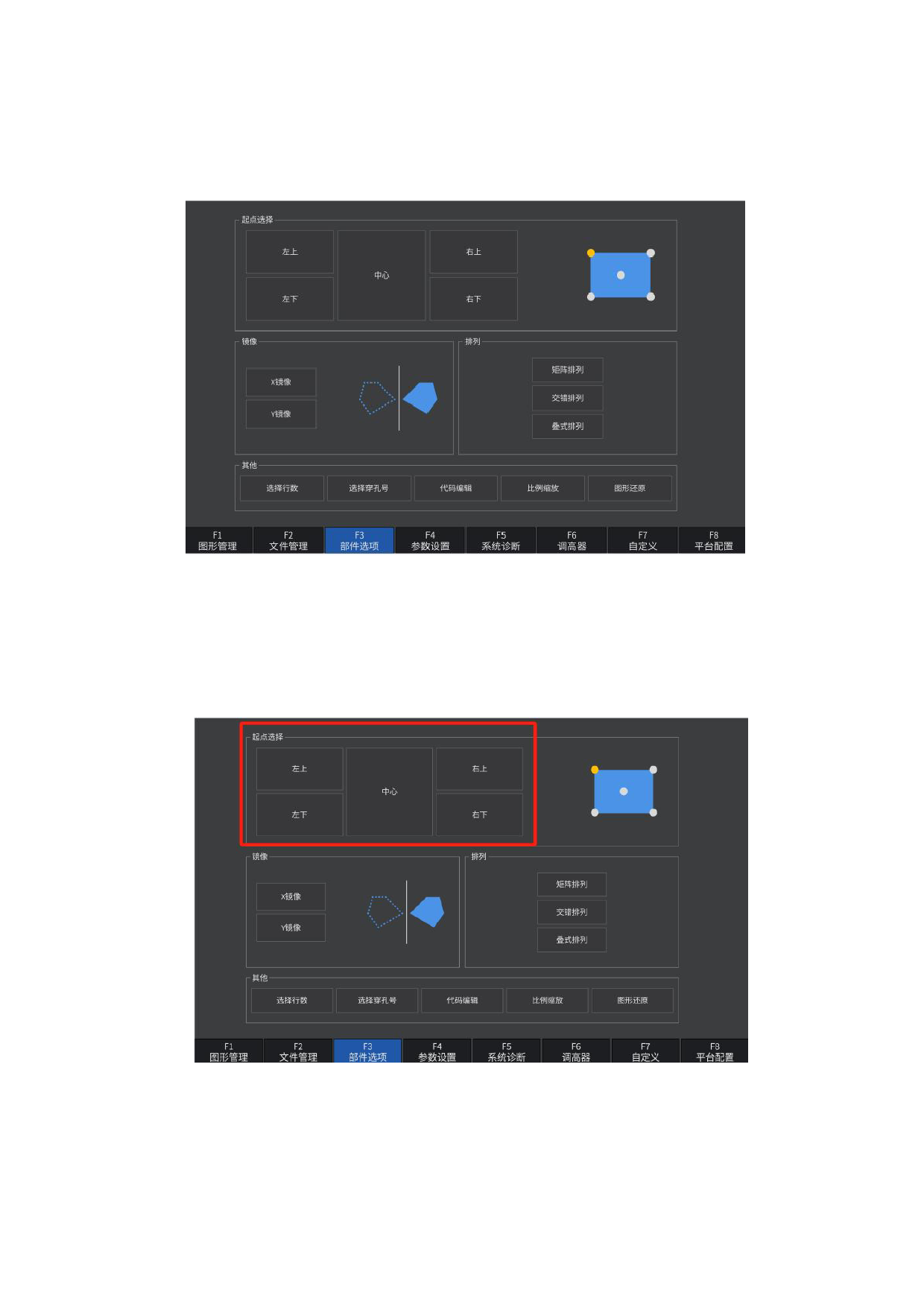 此时点击相应的起点选择位置后,切割零件的起点自动跳到相应的位置。例如点