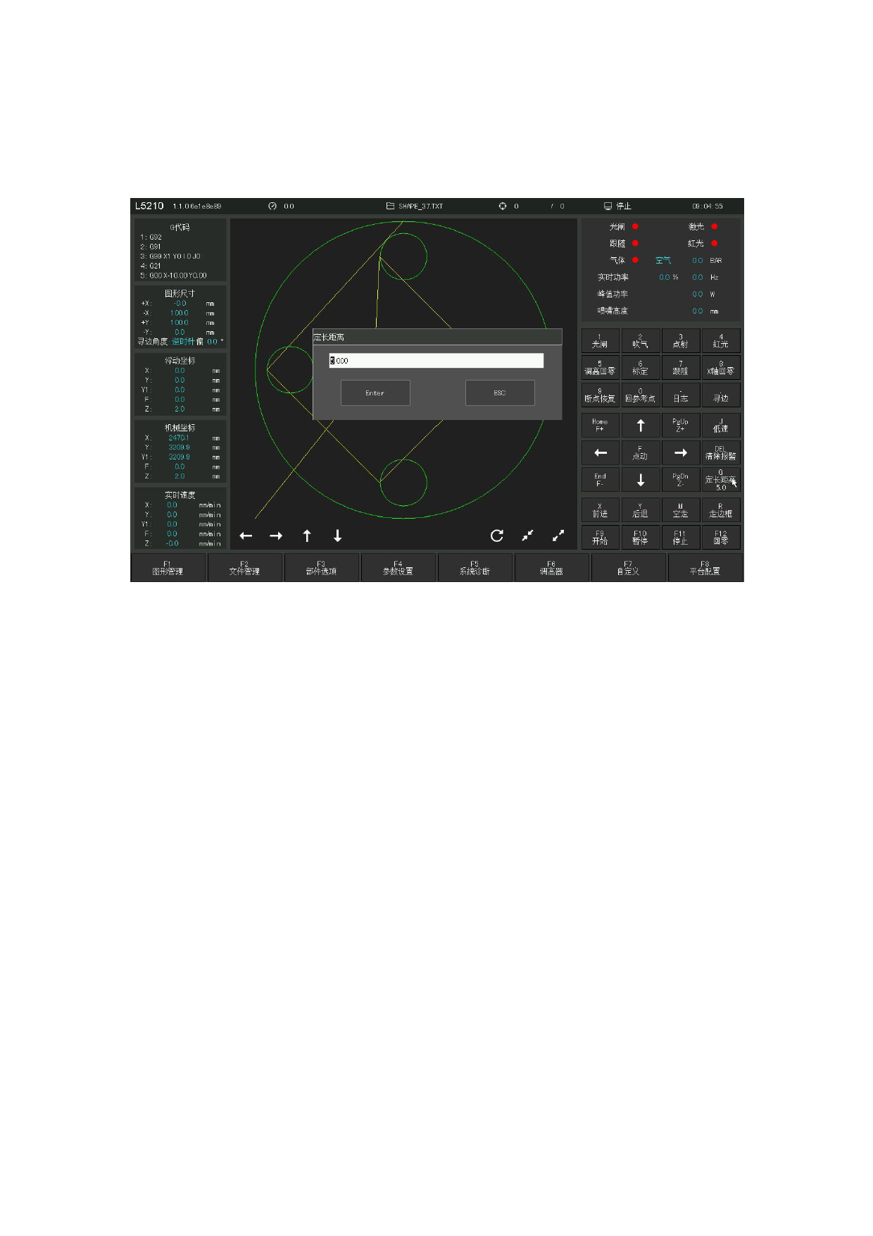 在手动界面按【F】进入定长移动。系统提示输入定长距离: