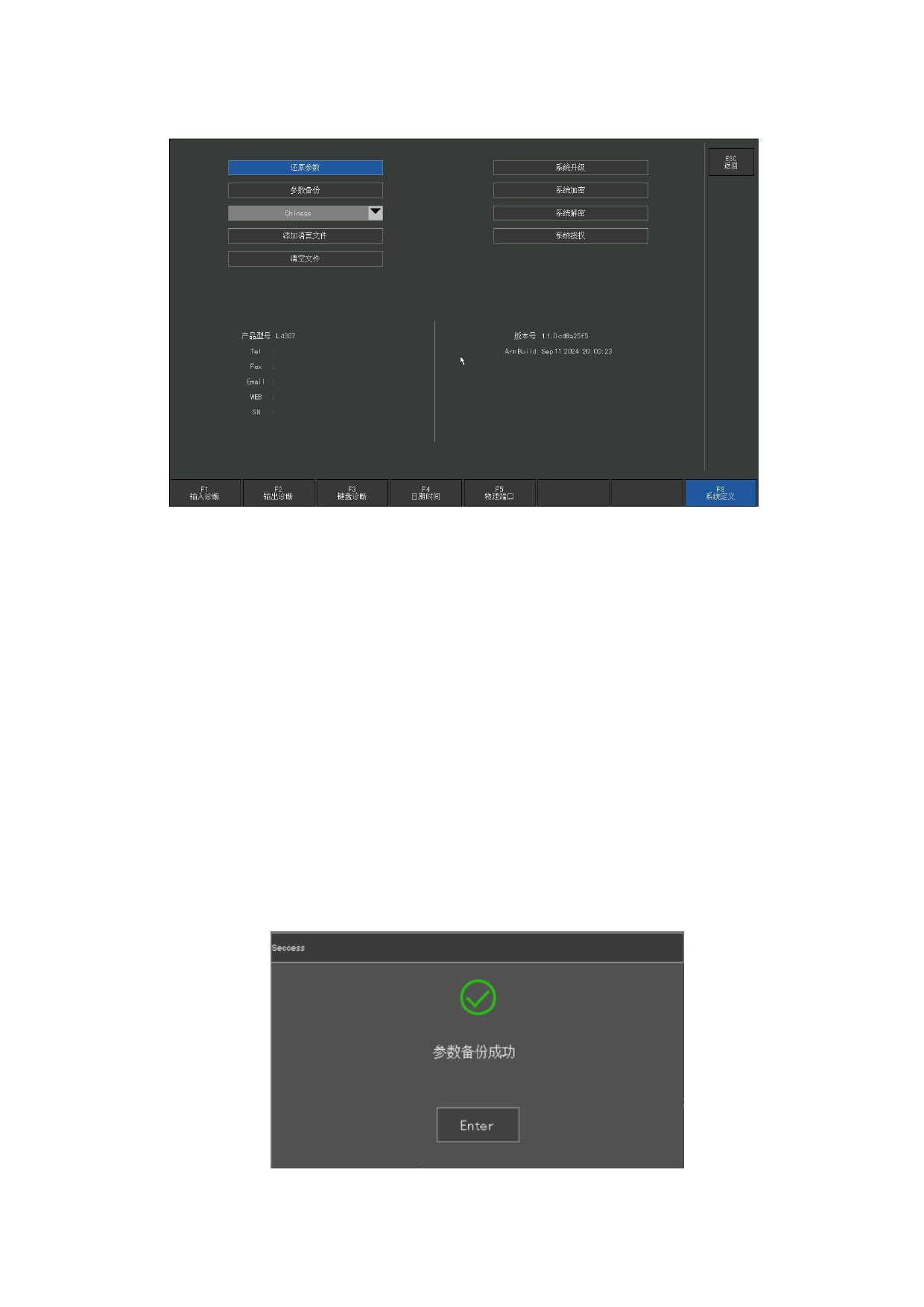 参数备份:备份参数的过程是,在系统的主界面下依次按下【F5】(系统诊断) -【F8】 (