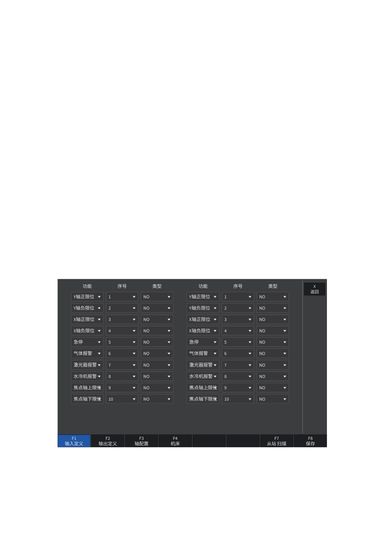 移、 枪 头 报 警 、减速输入、枪升输入、枪降输入、焦点轴上限位、焦点轴下限位、X