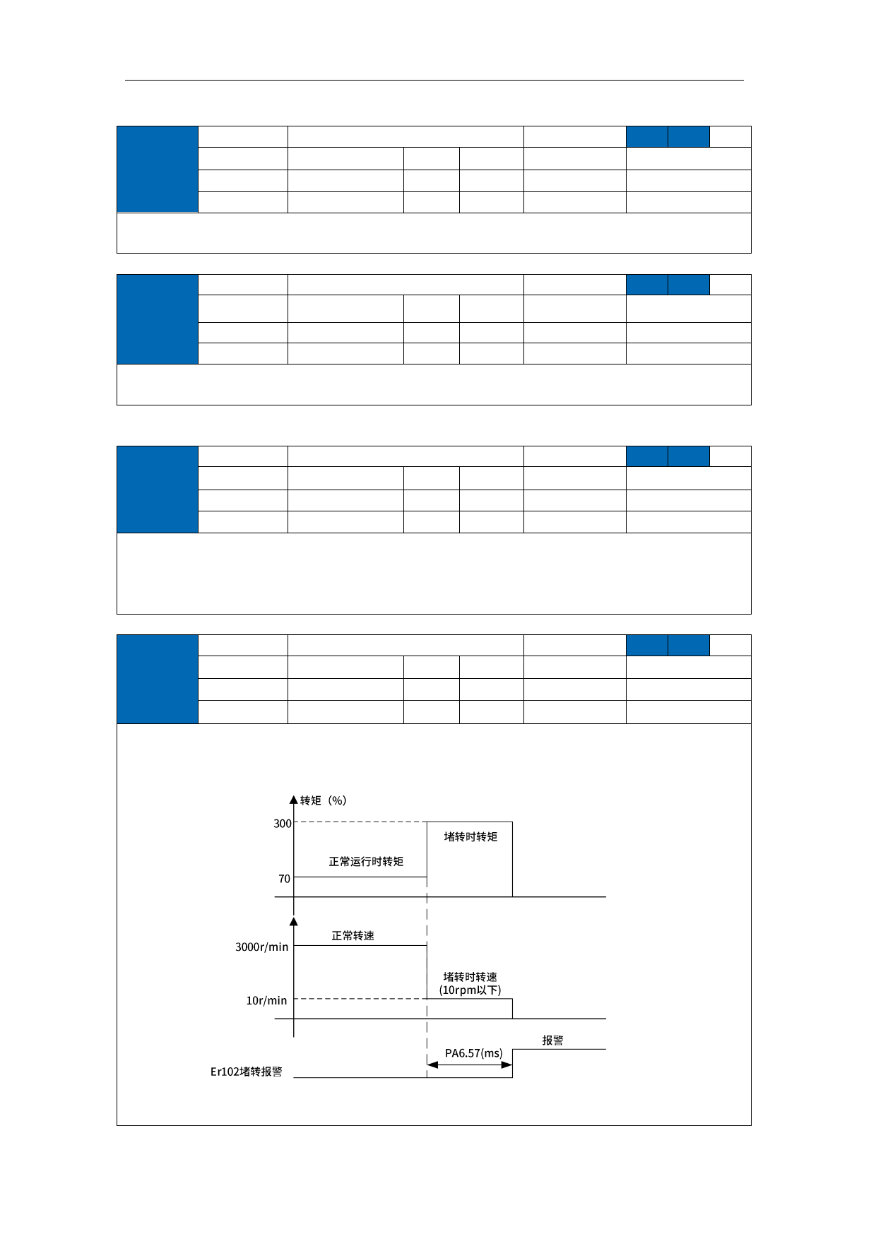 (在 10rpm 及以下的力矩输出%大于阈值且保持 PA6.57 所设时间,触发报警)