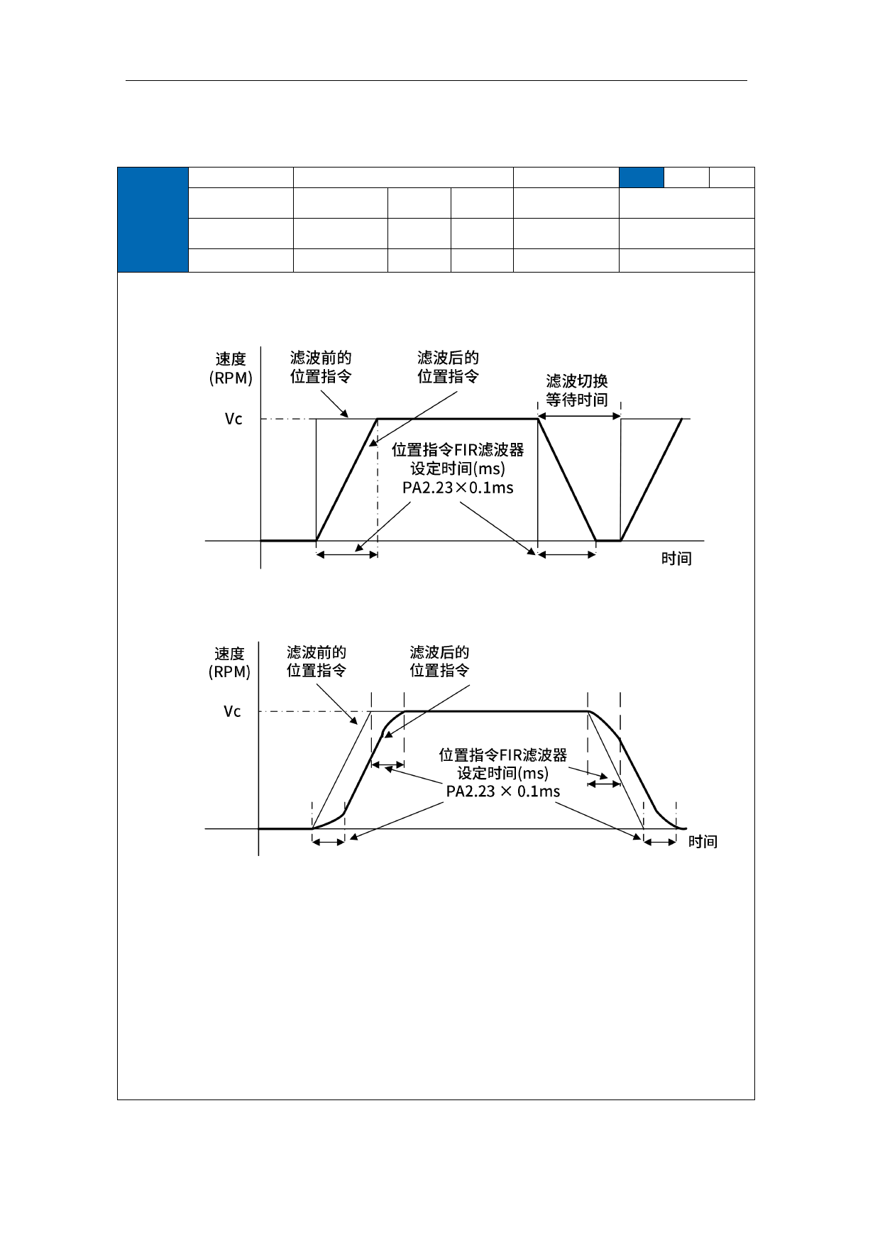 · 针对目标速度 Vc 的梯形波指令,如下图所示设定到达 Vc 为止的时间,滤波后为
