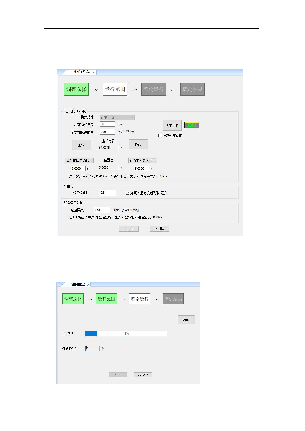 4.点击开始整定并确认运动安全时即可进入整定运行界面,将会开始整定,并在过程中提供