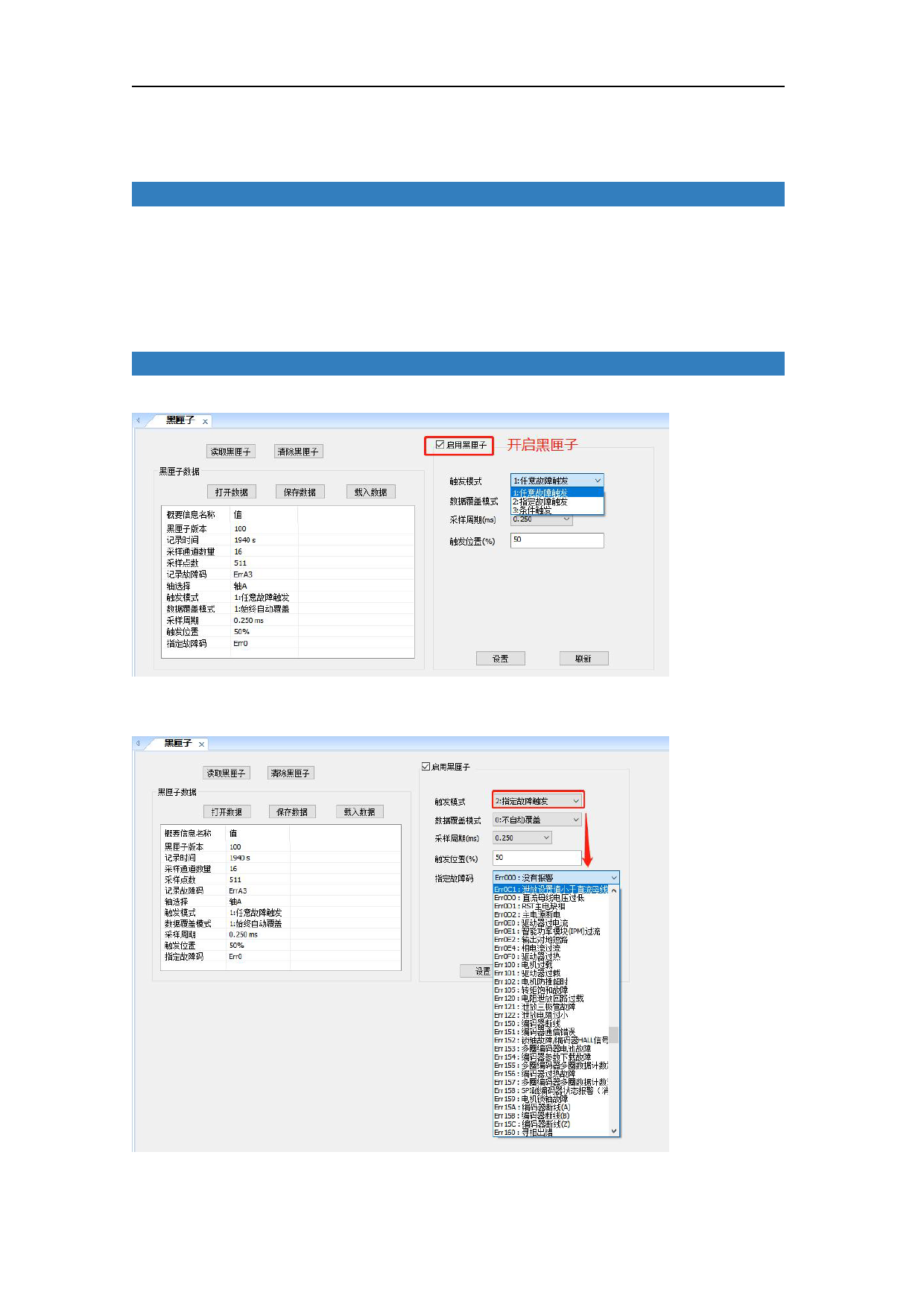 1.点击启用黑匣子,黑匣子触发模式有三种模式,分别是任意故障、指定故障、条件触发;