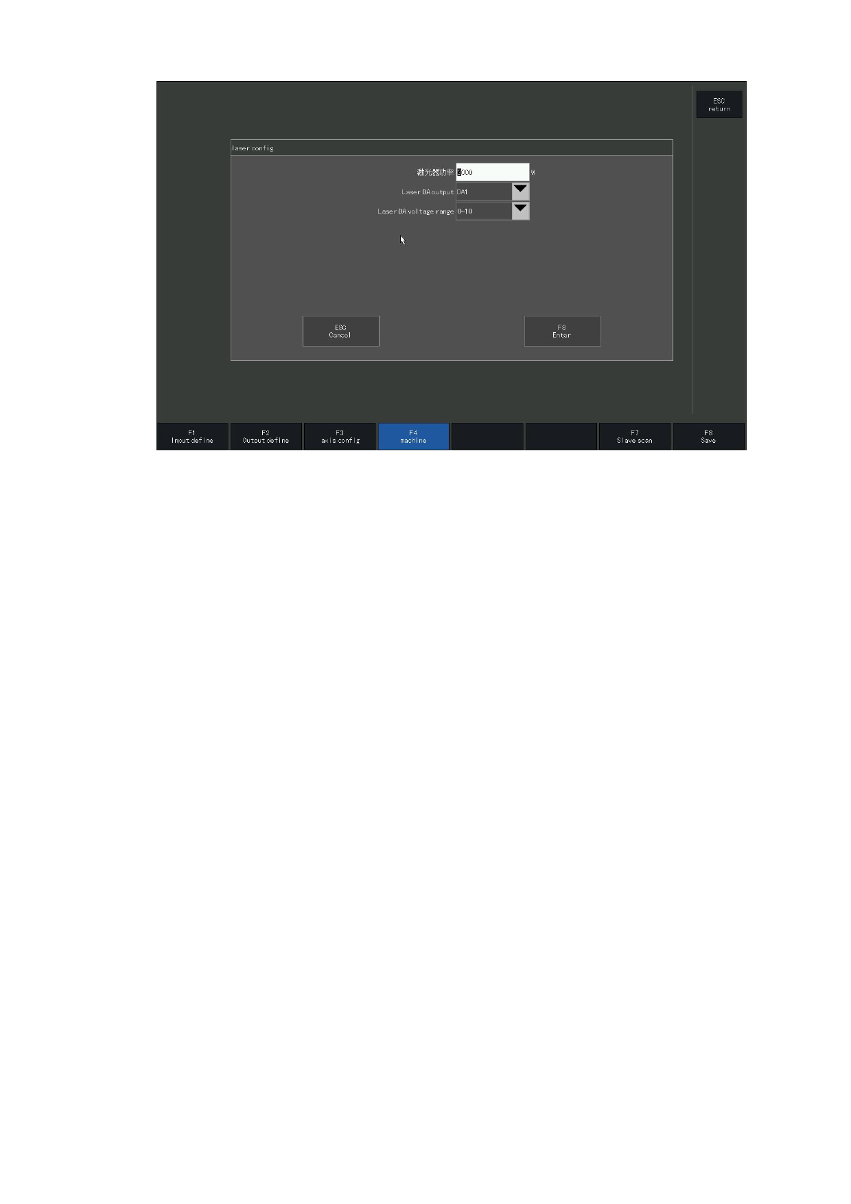 Under the [F 8 platform configuration] -> [F 4 machine tool] -> [laser] interface,