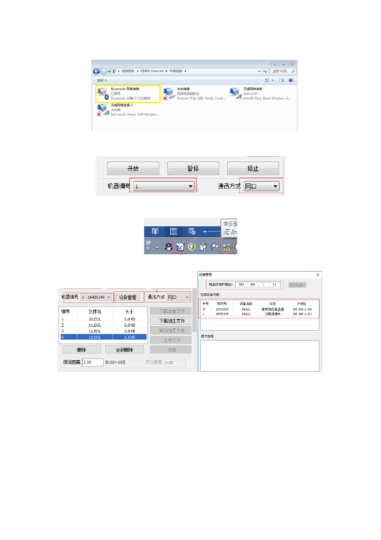 6:查看软件端连接方式选择设置是否正确,下图中机器编号选择以及通讯方式选择应该如
