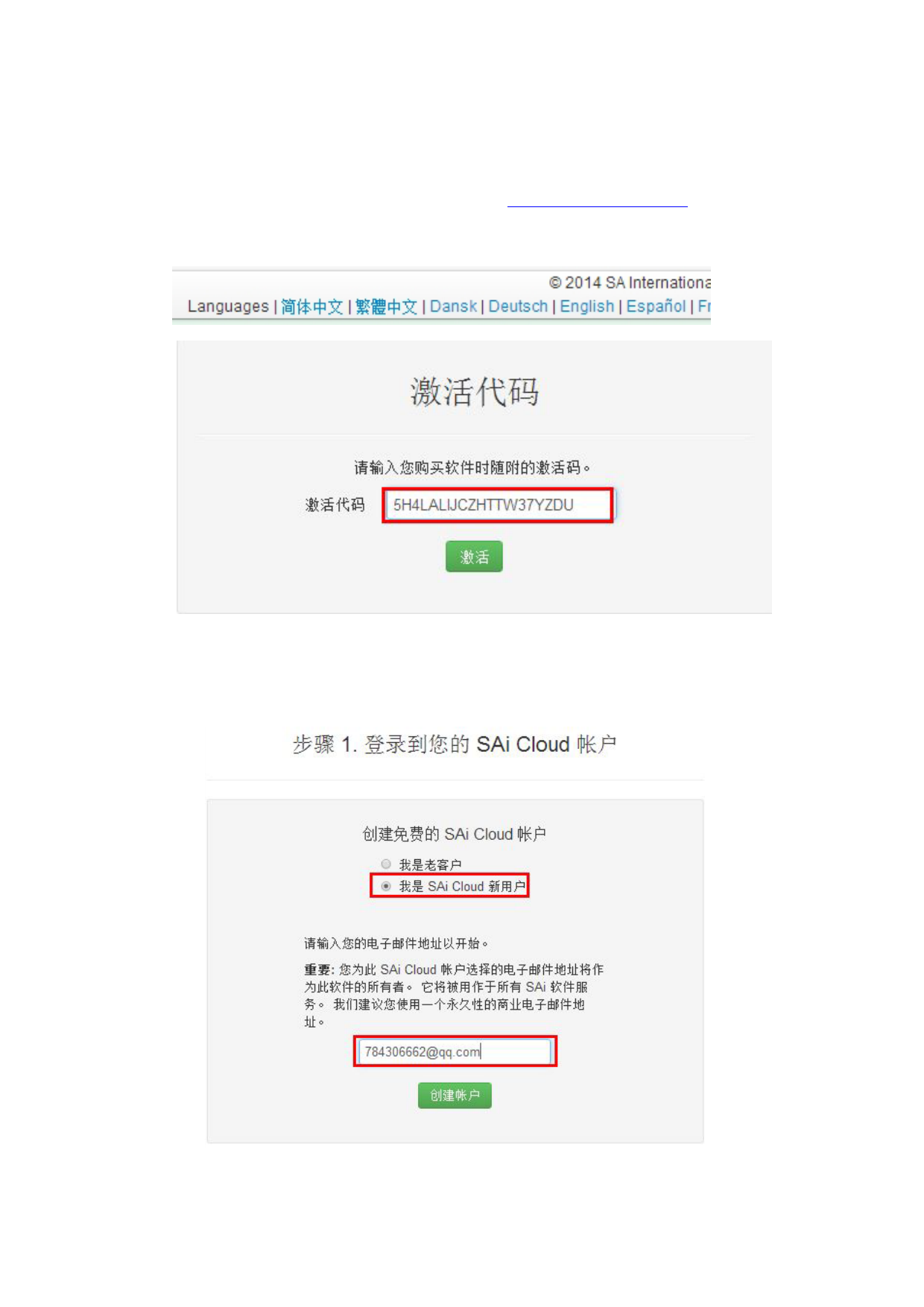 站后,在网站底部选择语言为中文,激活代码框中输入软件盒中的激活码,并点击激